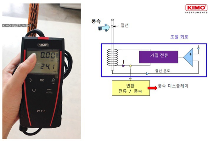 열선풍속계는 위와 같은 그림의 원리로 측정하게 됩니다.